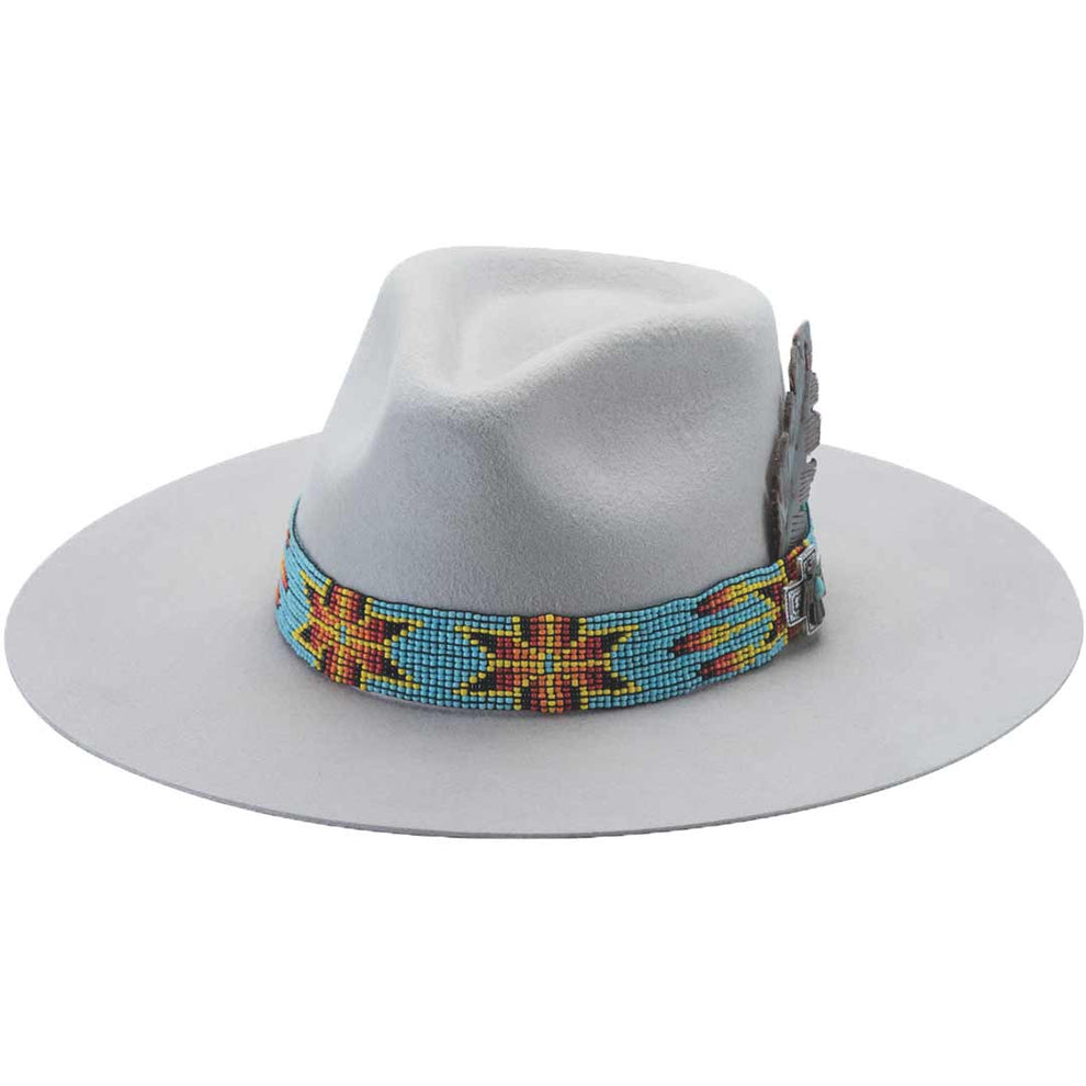The Rain Bird is a felt hat by Bullhide. The Rain Bird is part of Bullhides Western Couture Collection. It is a grey pinch front felt with a seed bead hat band with leather feather and concho accent.