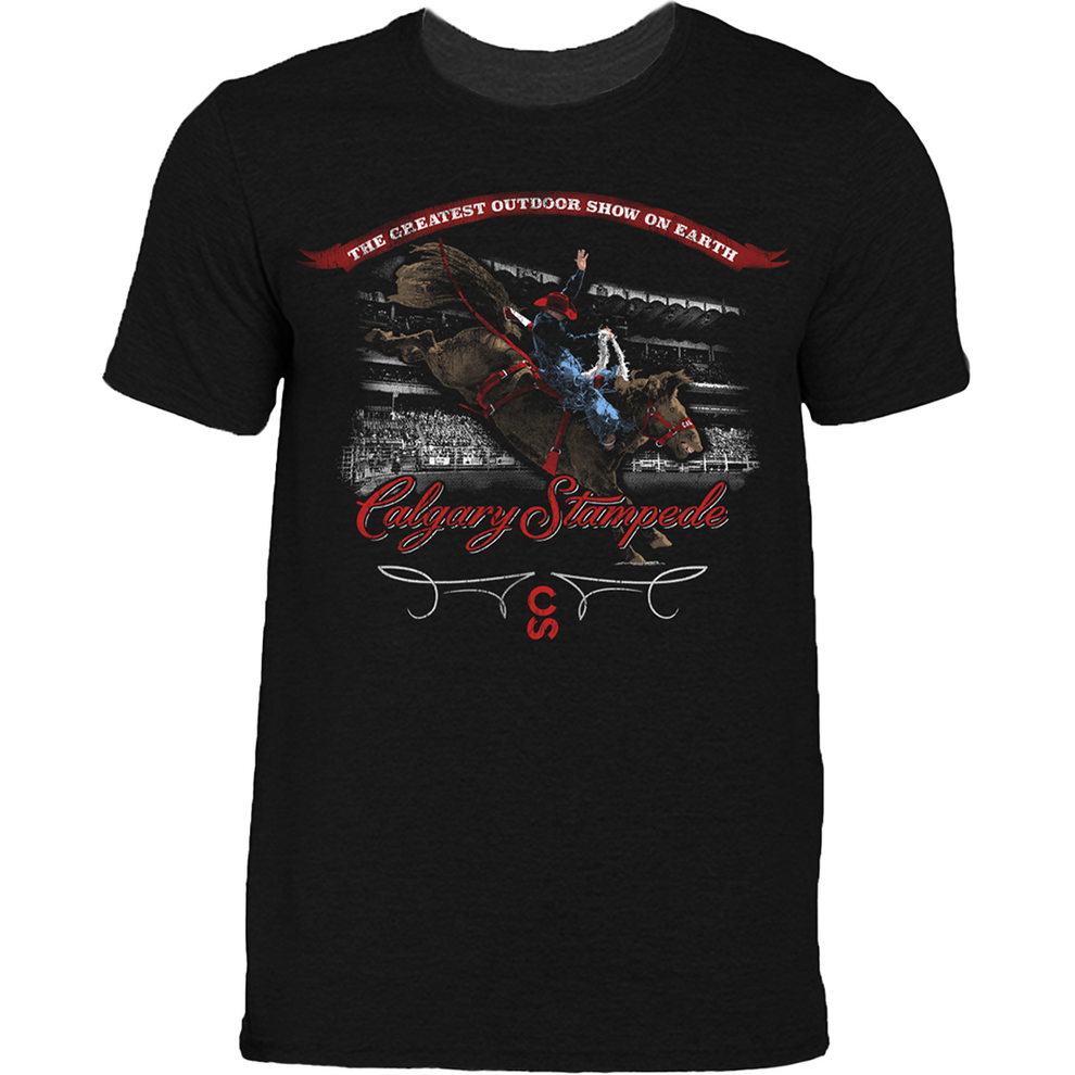 This Calgary Stampede T-shirt captures the spirit of the “Greatest Outdoor Show on Earth” with a bold image of a cowboy riding a wild horse and the official Calgary Stampede logo. Made in black with short sleeves and a classic crew neck, it’s a comfortable and iconic souvenir.