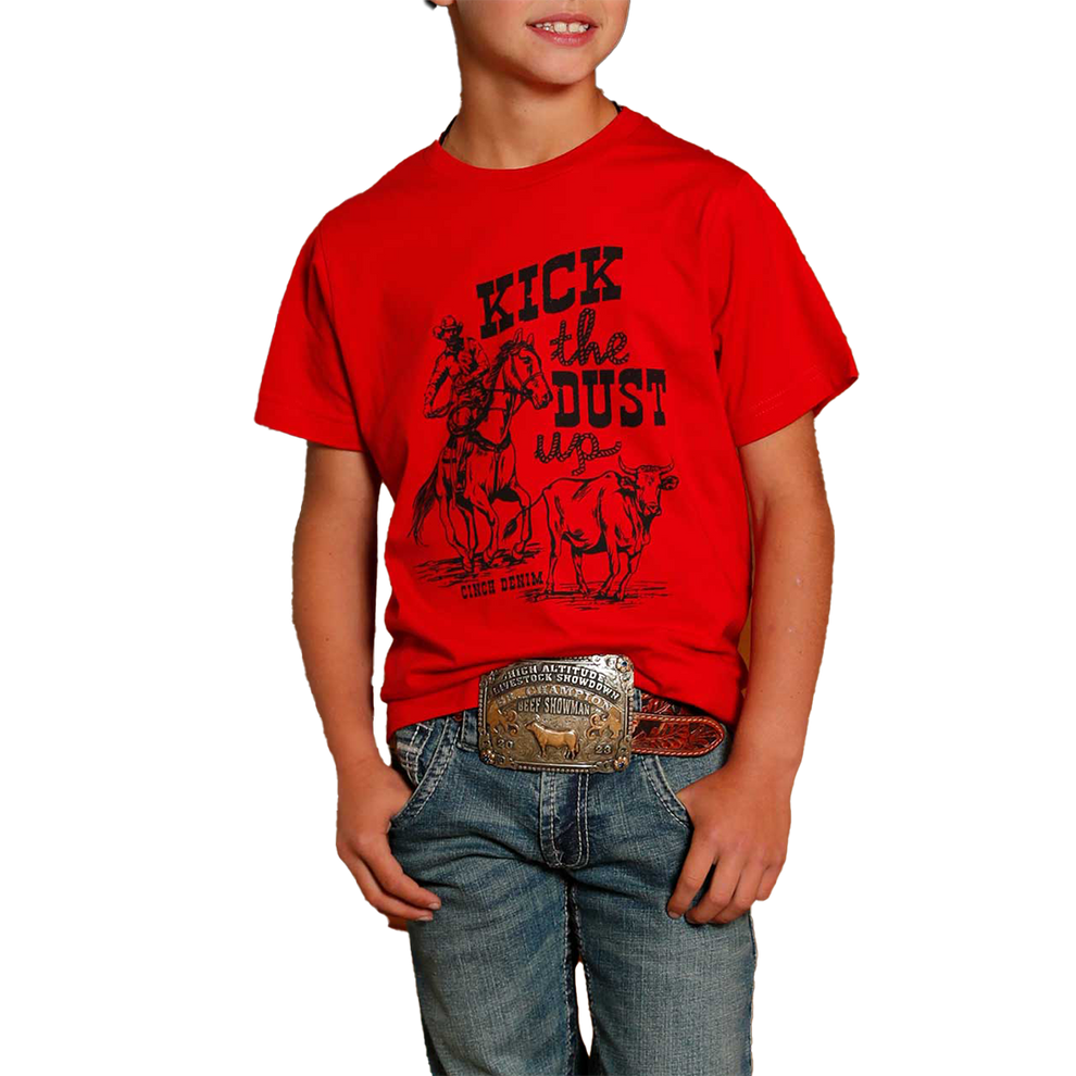 Let him show off his Western spirit with the Cinch Boys' Kick The Dust Up T-Shirt. This short sleeve, crew neck tee offers all-day comfort and casual style, perfect for play, school, or the rodeo. Featuring bold graphics and classic Cinch quality, it's a fun and easy choice for any young cowboy.