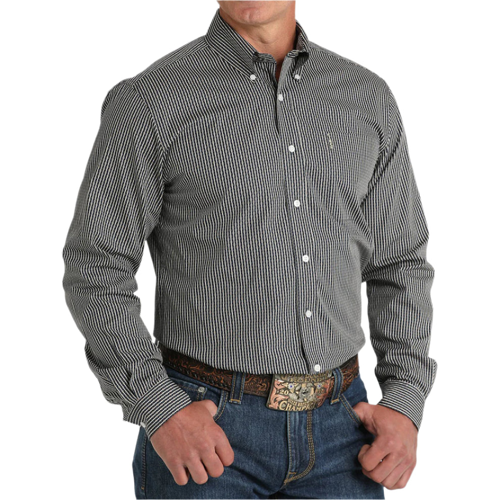 This handsome Modern Fit black microstripe shirt by CINCH is office ready and serves as a dependable weekend style hero. Comfortable cotton plain weave construction features an open left front pocket with embroidered logo and traditional white buttons.