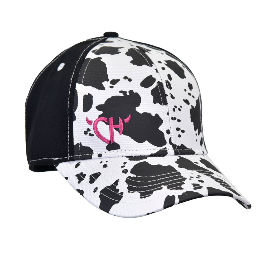 From Cowboy Hardware, this white and black cow print cap has white stitching, front panel with embroidered logo