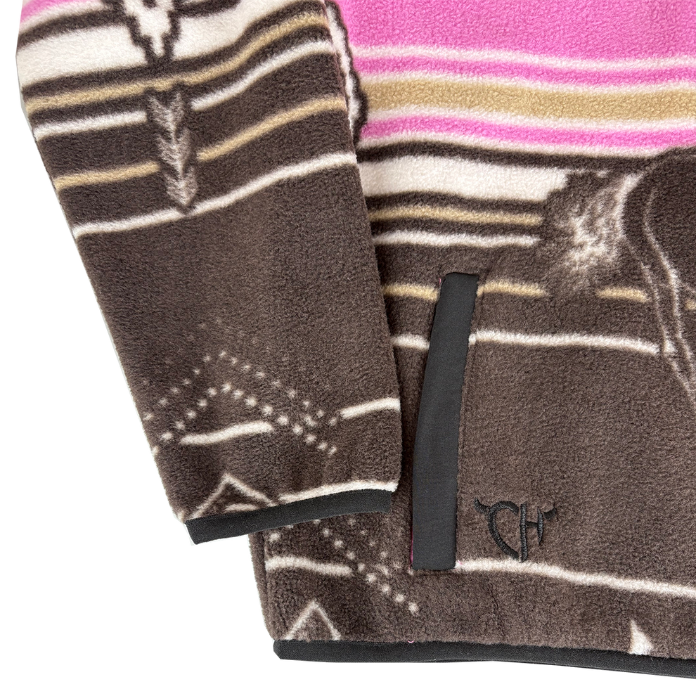 The Cowgirl Hardware Girls' Aztec Fleece Jacket blends cozy comfort with bold western style. Featuring a vibrant Aztec print, this soft fleece jacket includes a 1/4 zipper for easy layering, two handy pockets, and a high collar to keep her warm on chilly days. Perfect for everyday wear with a touch of cowgirl flair.