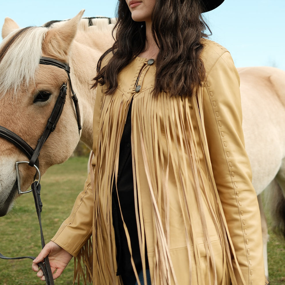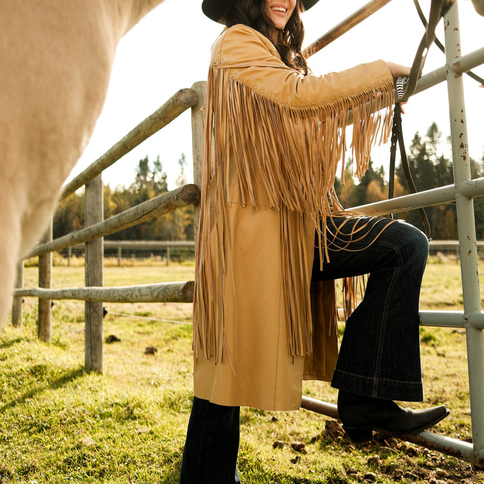 A FOREVER FAVOURITE. This sheepskin statement-maker has proven it has staying power, over and over again. The straight-line silhouette features double concho buttons at the neck and tonal leather lacing details, but it’s the bold hues and full-length fringe that are going to have you turning heads and dropping jaws! WARNING: The colours just keep getting better and better, you may develop a Sonora hoarding habit!