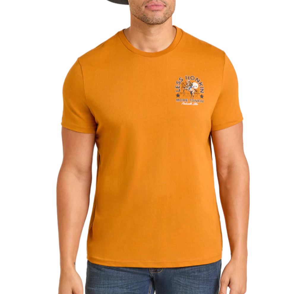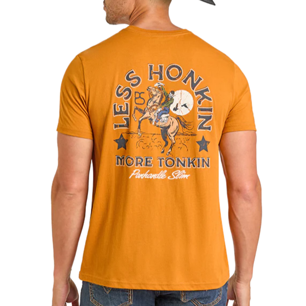 Stay cool and comfy in the Panhandle Slim Less Honkin, More Tonkin Graphic T-Shirt. Featuring a PS bronc rider graphic, this unisex t-shirt is made from 60% cotton and 40% polyester. This stylish tee will add a touch of Western style to any casual outing.