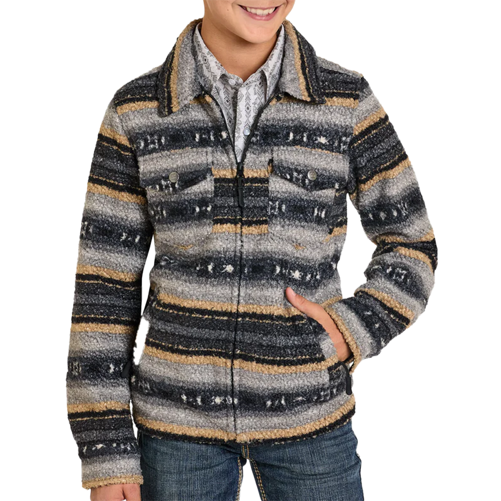 Stay stylish and warm with the Boys' Striped Aztec Berber Jacket. This jacket features a distinctive Aztec pattern and a zip closure. The long sleeves and teddy berber fabric offer both comfort and a unique aesthetic, perfect for cooler days.