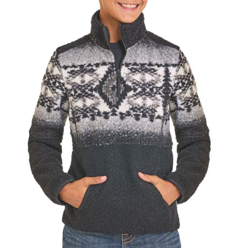 Keep him warm in bold Western style with this cozy Aztec 1/4 Zip Pullover from Powder River Outfitters. Made from ultra-soft 100% polyester teddy berber fleece, it delivers superior comfort and insulation on chilly days. The eye-catching Aztec print and convenient quarter-zip design make it perfect for layering during cooler weather.