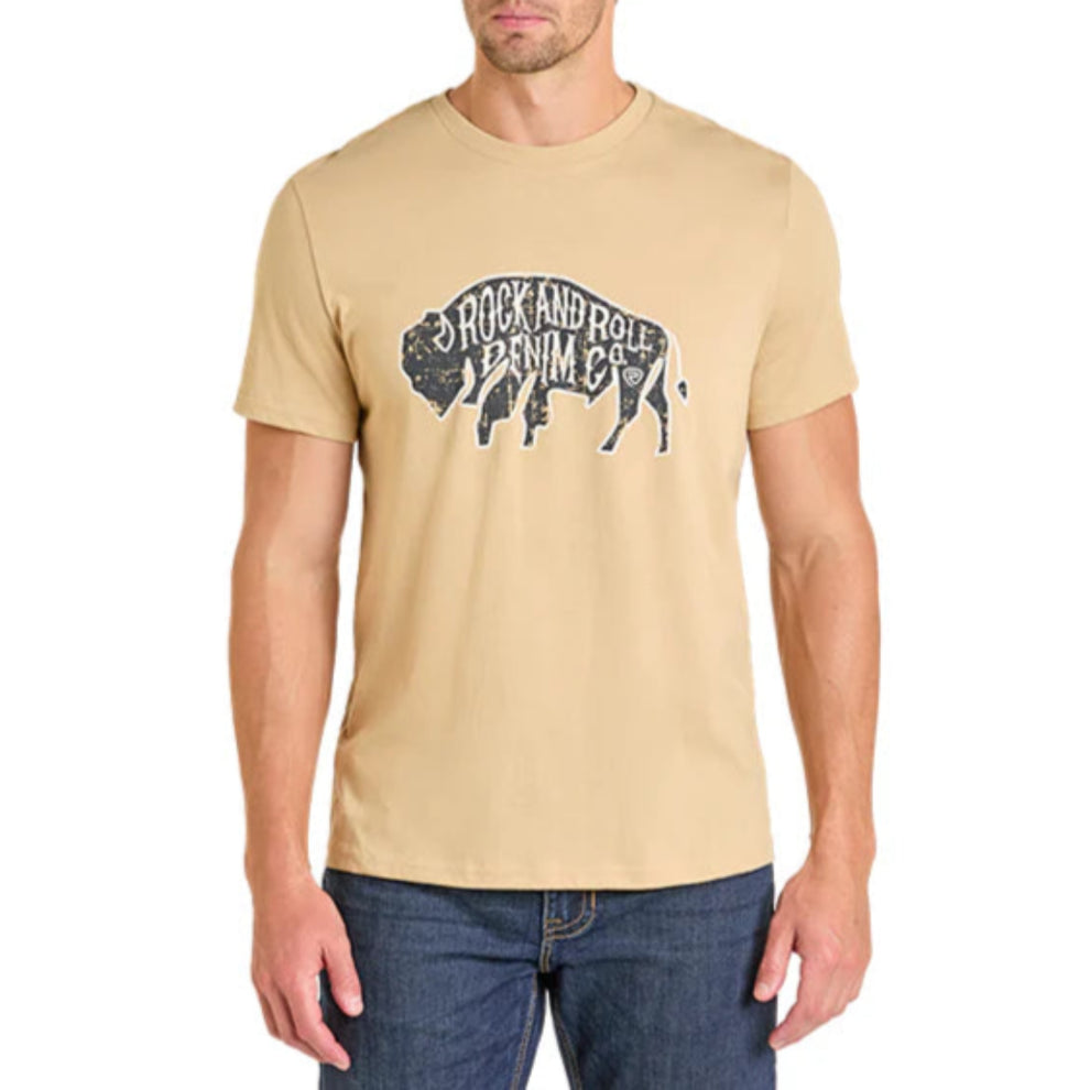 Show off your western spirit with the Rock & Roll Denim Unisex Buffalo Graphic T-Shirt. Crafted from a soft 60% cotton, 40% polyester blend, this tan tee features a bold buffalo chest graphic that adds rugged personality to any outfit. The ribbed crew neckline and standard fit offer everyday comfort and a relaxed feel, making it perfect for both men and women who live the western lifestyle.