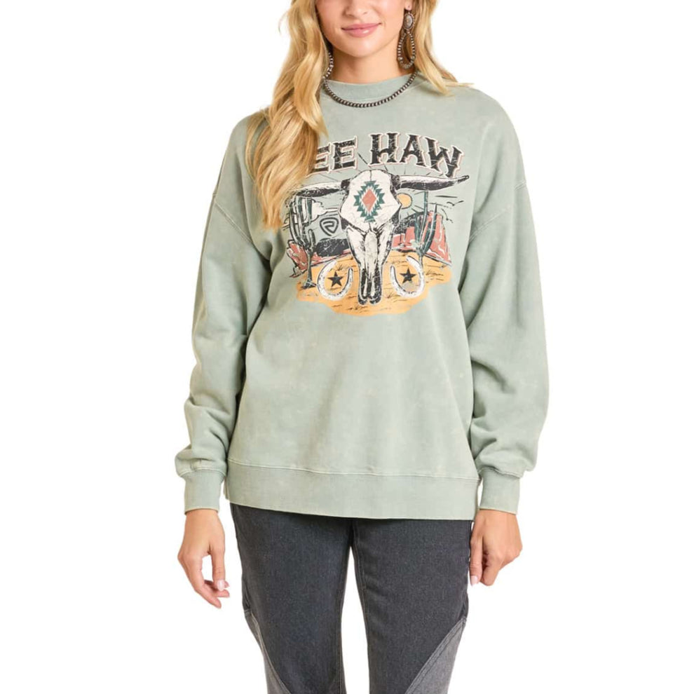 Embrace casual comfort with the Rock & Roll Denim Women's Yee Haw Sweater. It features a Steerhead print featuring the Yee Haw logo and is made of cotton. Its loose fit and long sleeves make it ideal for cozying up on chilly days.