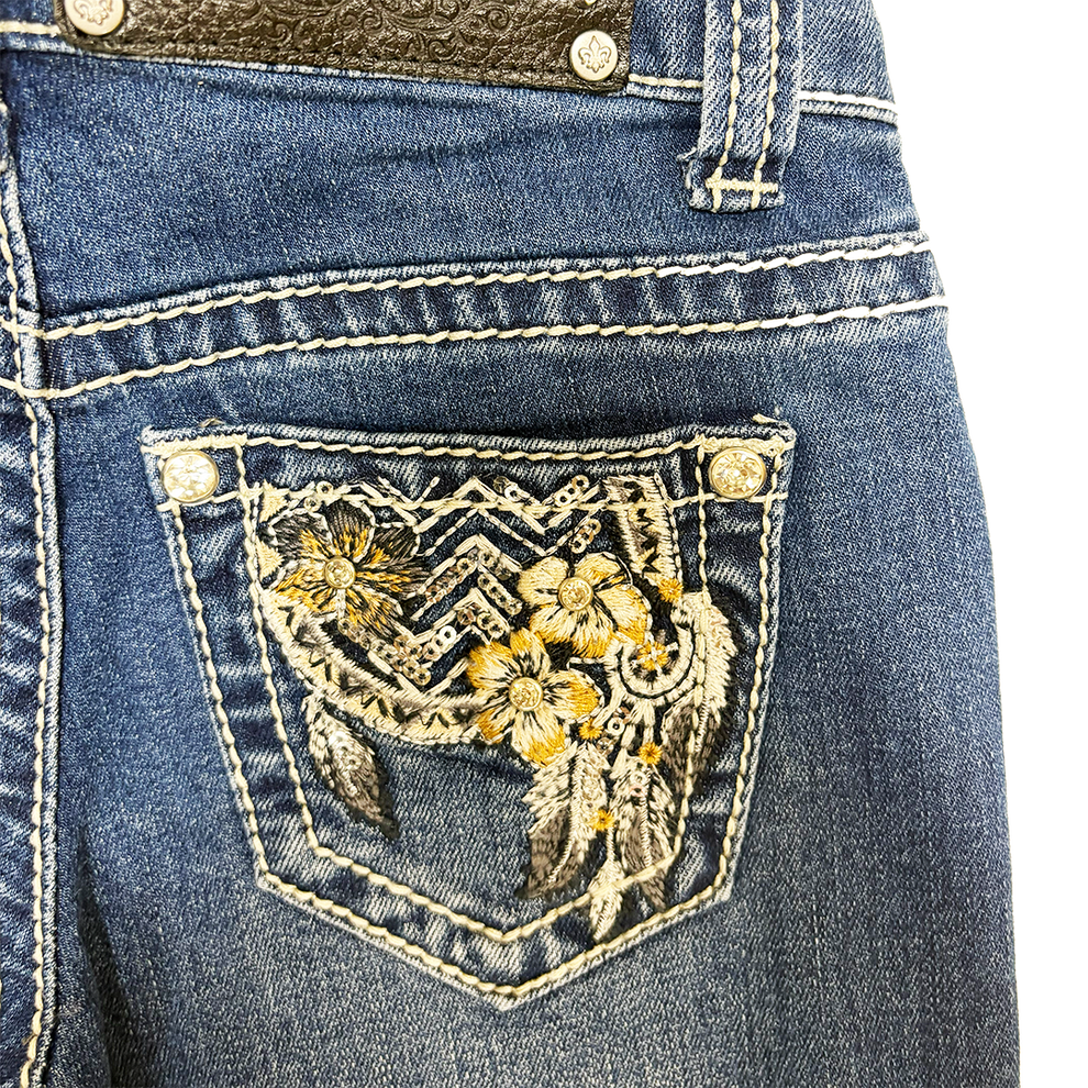The Rodeo Girl Girls' Dreamcatch Embroidery Bootcut Jeans are the perfect blend of comfort, style, and durability for young cowgirls. Featuring a flattering bootcut fit and a mid-rise design, these jeans offer a classic look with a modern twist. The medium wash gives them a sleek, versatile appearance, making them suitable for both casual wear and more dressed-up occasions.