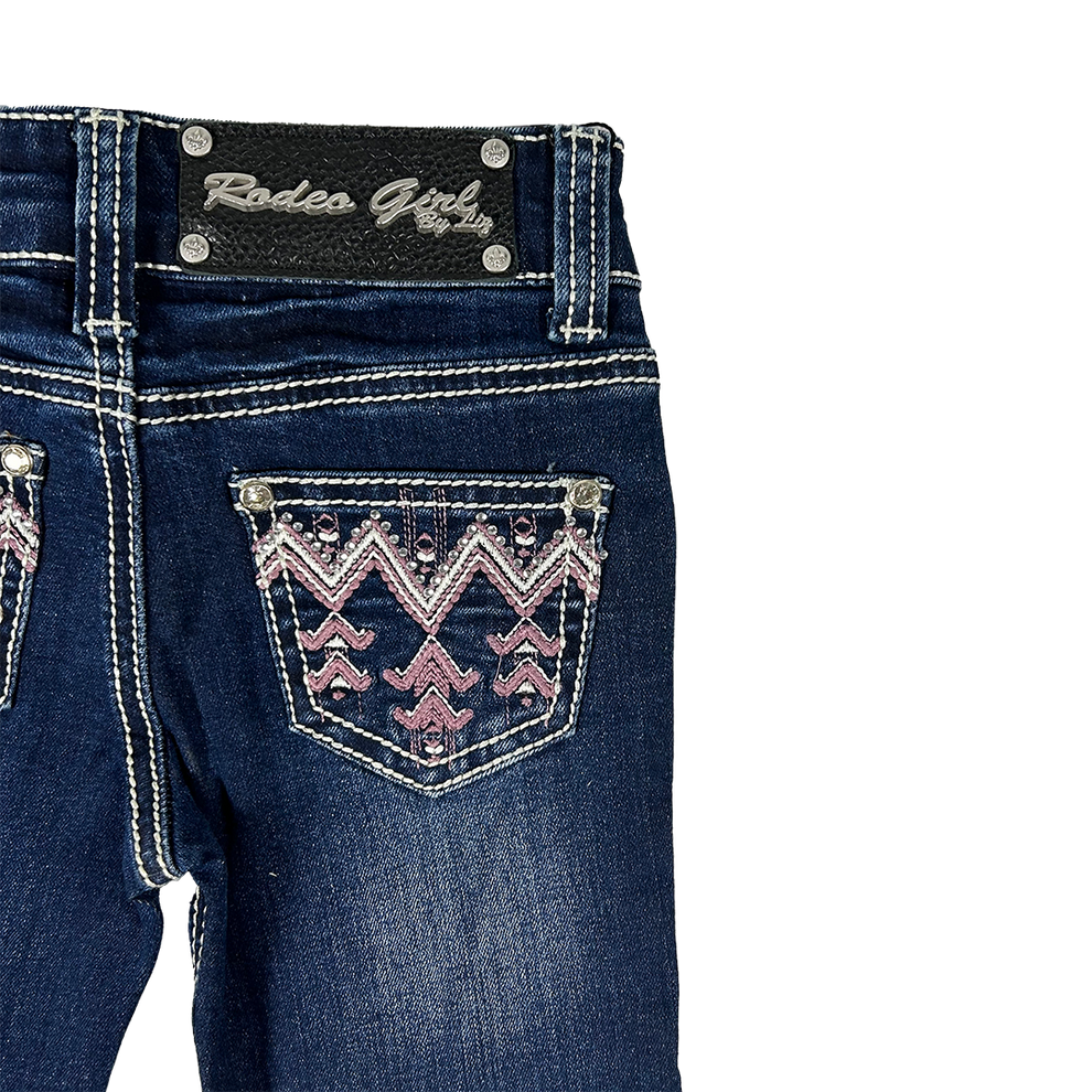 The Rodeo Girl Girls' Aztec Embroidery Bootcut Jeans are the perfect blend of comfort, style, and durability for young cowgirls. Featuring a flattering bootcut fit and a mid-rise design, these jeans offer a classic look with a modern twist. The dark wash gives them a sleek, versatile appearance, making them suitable for both casual wear and more dressed-up occasions.