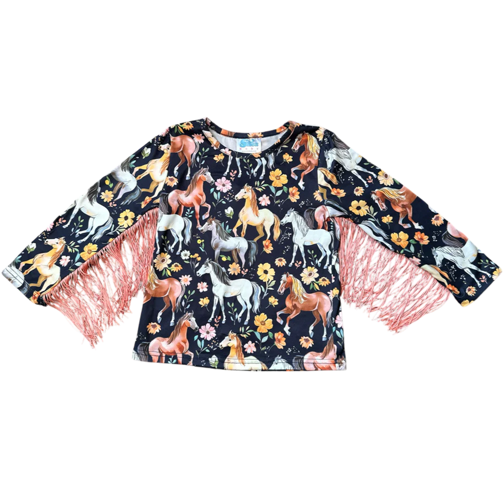 This adorable fringe shirt is the perfect addition to any fall and winter collection! Soft, comfortable and stylish! This print will pair with multiple styles of Shea Baby Boots. Don't forget to complete the look with our bows and concho belts!