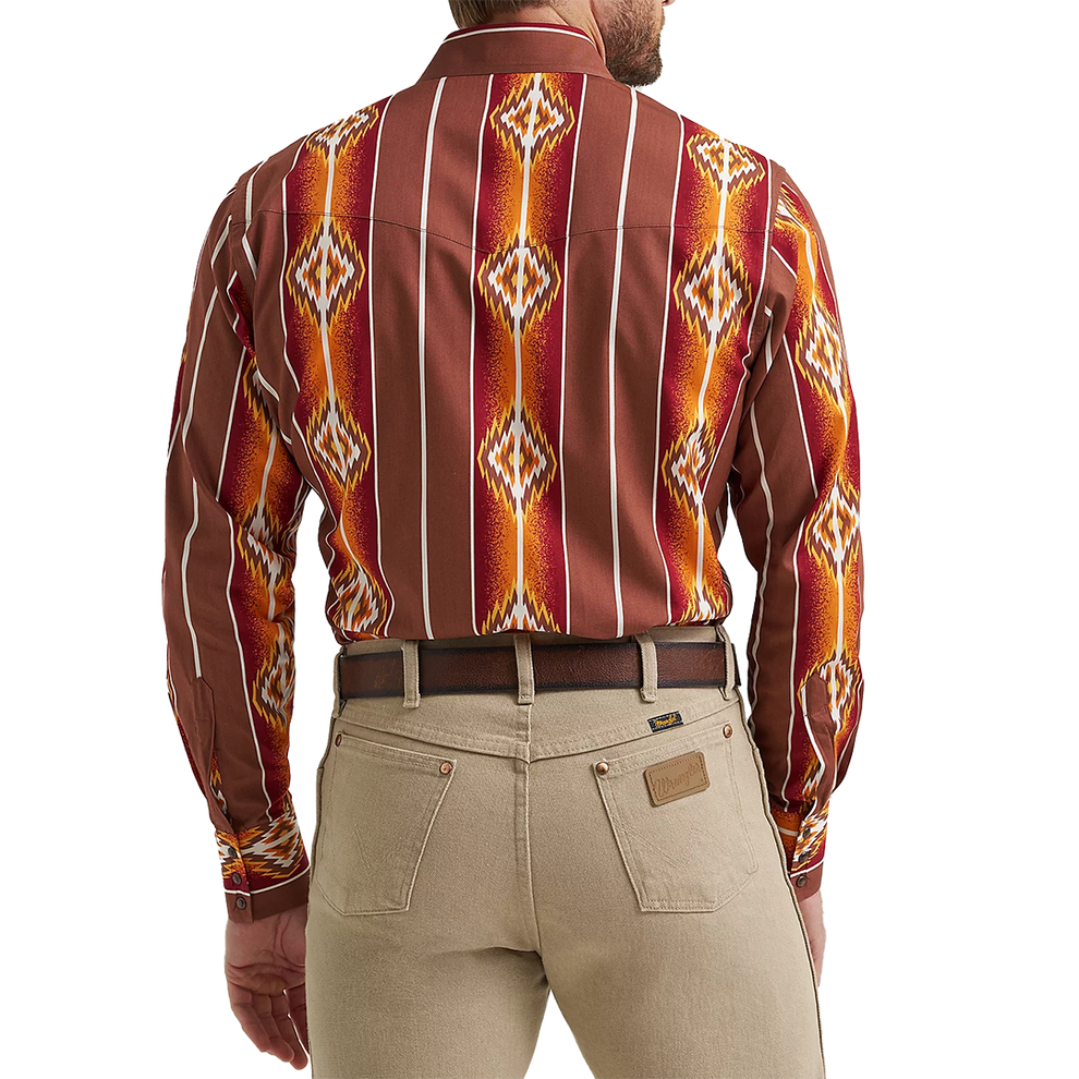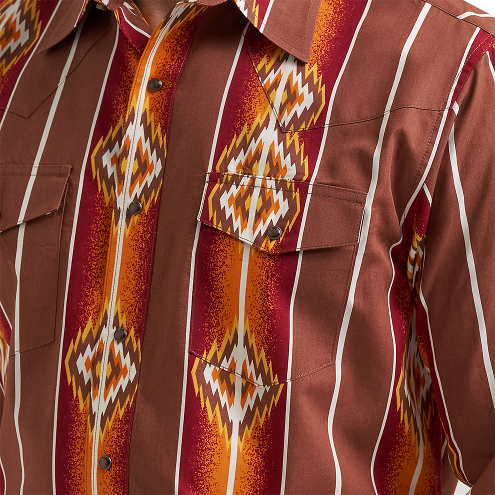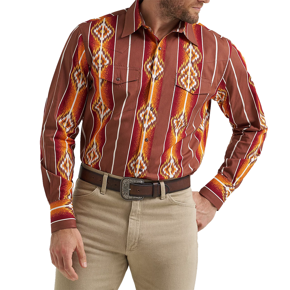 Wrangler's Checotah has a home in the closets of cowboys around the world. This men's Checotah long-sleeve western snap Navajo-inspired printed shirt is designed to make a statement no matter the destination. It features a classic fit, a spread collar, pointed yokes, two snap flap pockets with a convenient pencil slot, adjustable cuffs, and a full-length snap closure for the finishing touch. Best of all, it's crafted from cotton for uncompromising comfort. Look sharp at a moment's notice by wearing your Checotah shirt with a Wrangler Retro or Cowboy Cut jean.