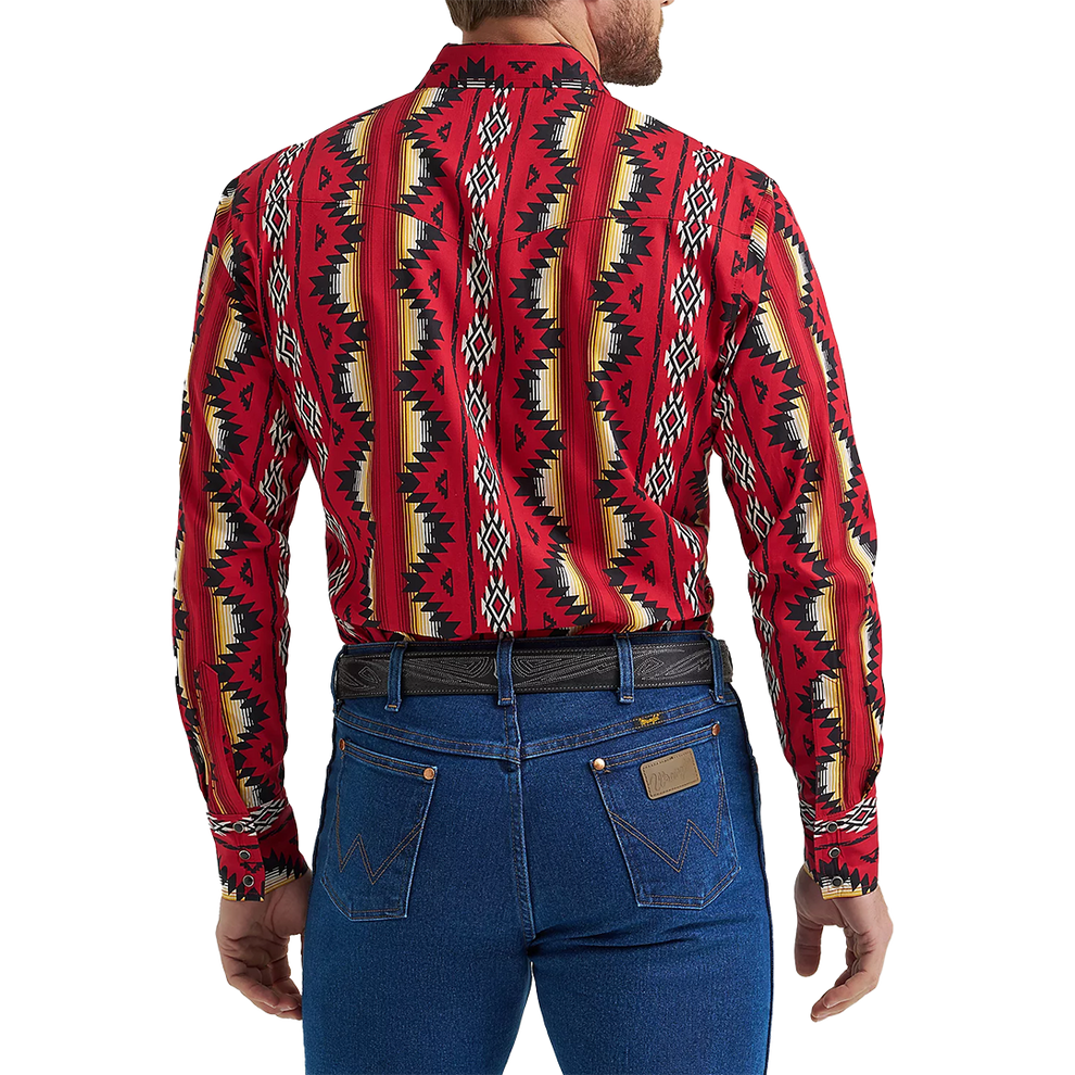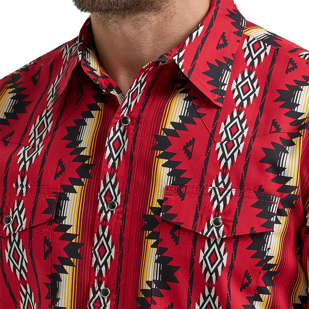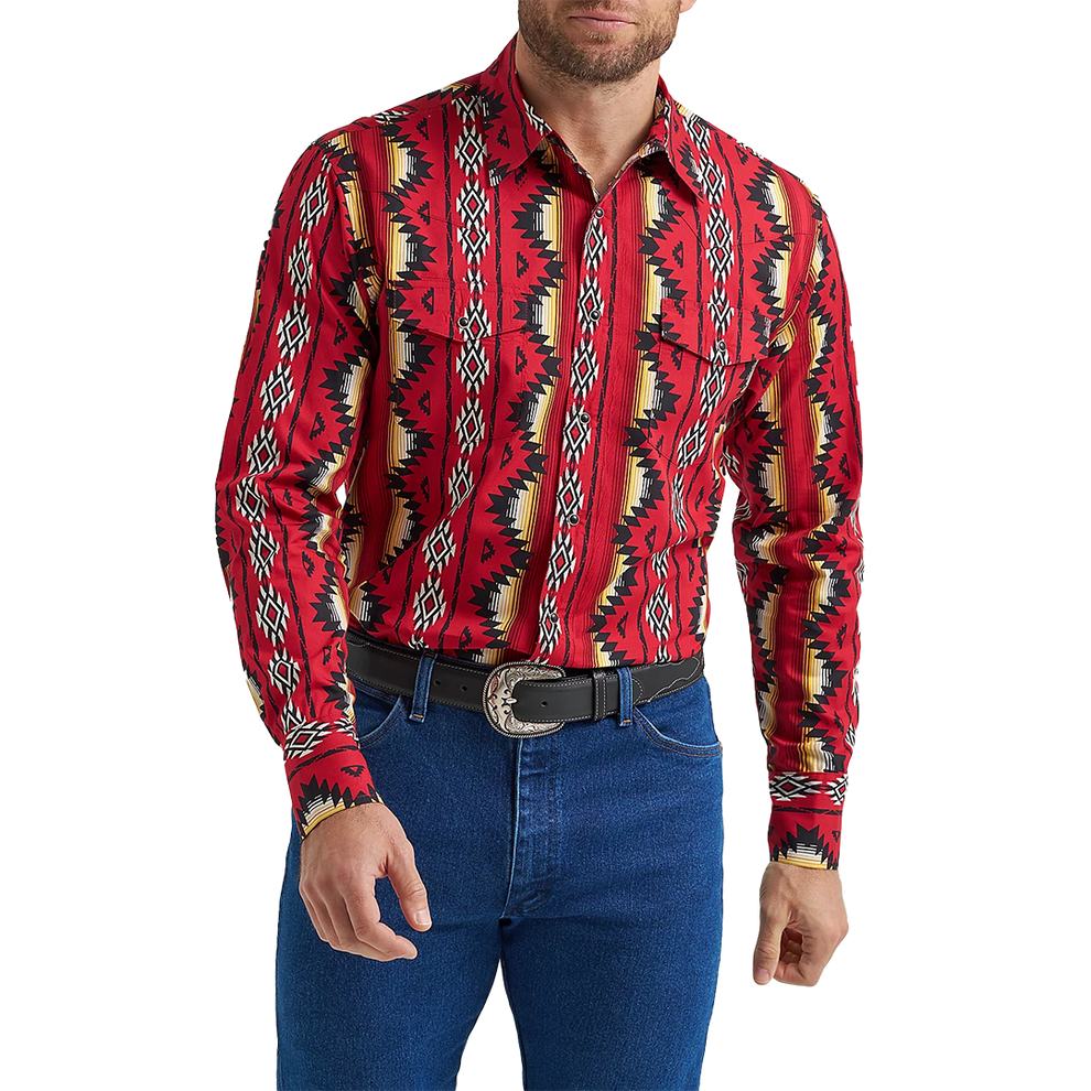 Wrangler's Checotah has a home in the closets of cowboys around the world. This men's Checotah long-sleeve western snap Navajo-inspired printed shirt is designed to make a statement no matter the destination. It features a classic fit, a spread collar, pointed yokes, two snap flap pockets with a convenient pencil slot, adjustable cuffs, and a full-length snap closure for the finishing touch. Best of all, it's crafted from cotton for uncompromising comfort. Look sharp at a moment's notice by wearing your Checotah shirt with a Wrangler Retro or Cowboy Cut jean.