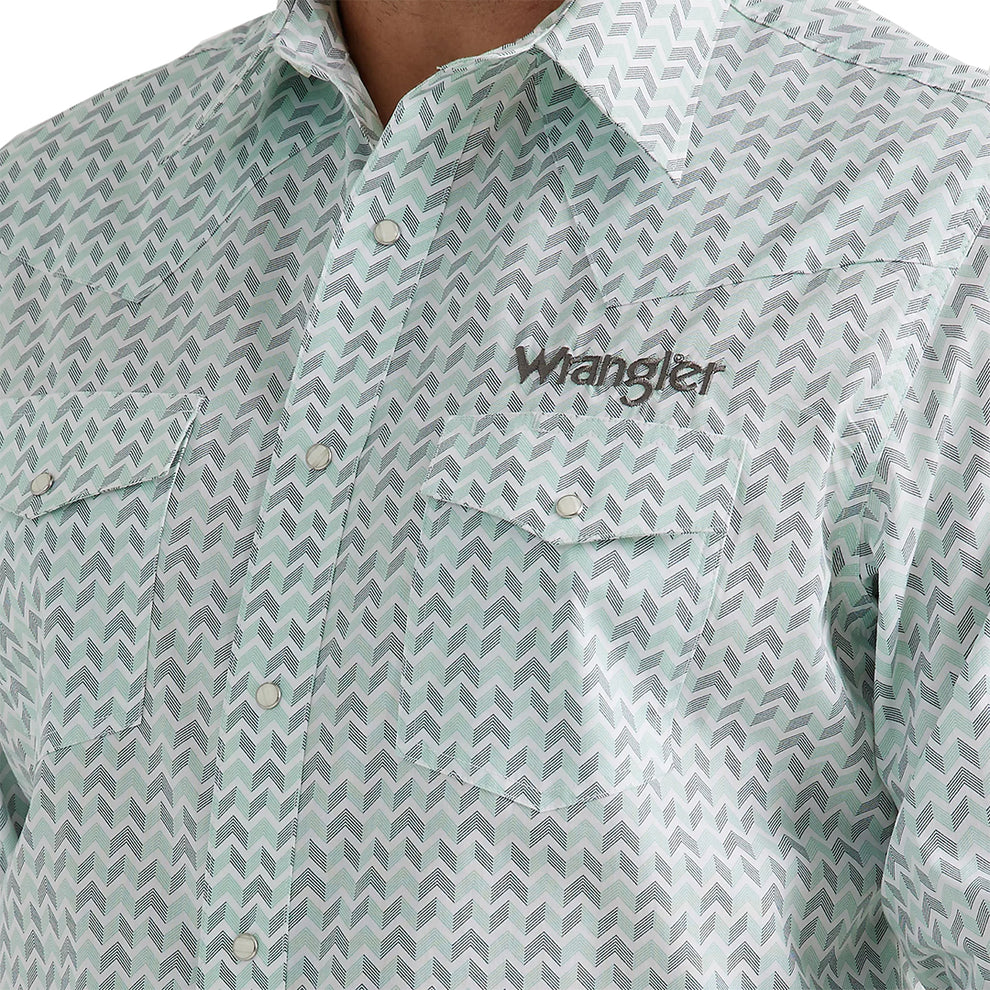 It comes with all the classic details you've come to know and trust about Wrangler snap shirts, including a spread collar, snap flap pockets with a one-inch pencil slot on the right, a pointed yoke in the back.