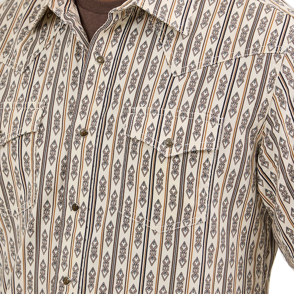 Look good while feeling good in the men's Wrangler Retro® long-sleeve western snap printed shirt. This contemporary take on the classic style you love comes packed with all the distinctive details, including pointed front and back yokes, single-needle stitching at the placket, modern fit, contrast trim, two snap cuffs, and two chest flap pockets with snaps. This long-sleeve snap shirt features a modern fit and it's crafted from cotton for comfort, minimal wrinkling, and long-lasting looks. Complete the outfit with Wrangler Retro jeans.