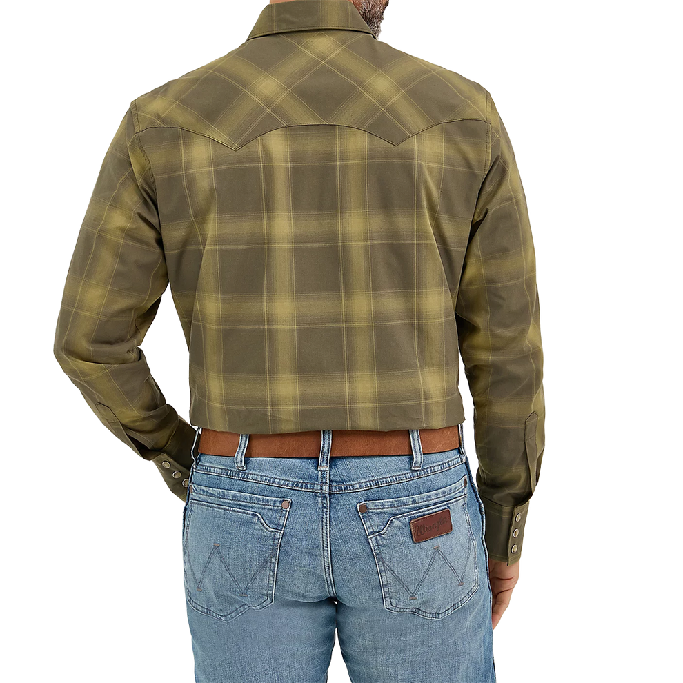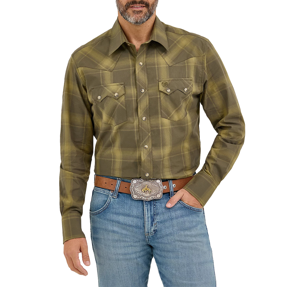 Paying tribute to our Western roots, the men's Wrangler Retro® long-sleeve sawtooth snap pocket western shirt gives the classic style you know a modern look and feel. It comes with all the same details you love, including a spread collar, pointed yokes, and two sawtooth snap flap pockets with embroidery to add a bold element to every outfit. Plus, it features a modern fit and it's crafted from cotton for comfort and long-lasting durability, no matter how often you wear it. Wear it with a pair of Wrangler Retro bootcut jeans to complete the look for any occasion.