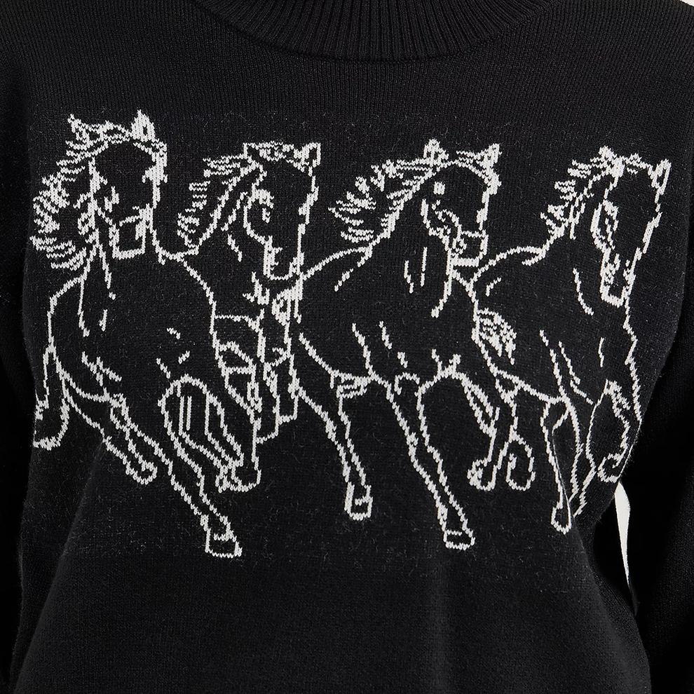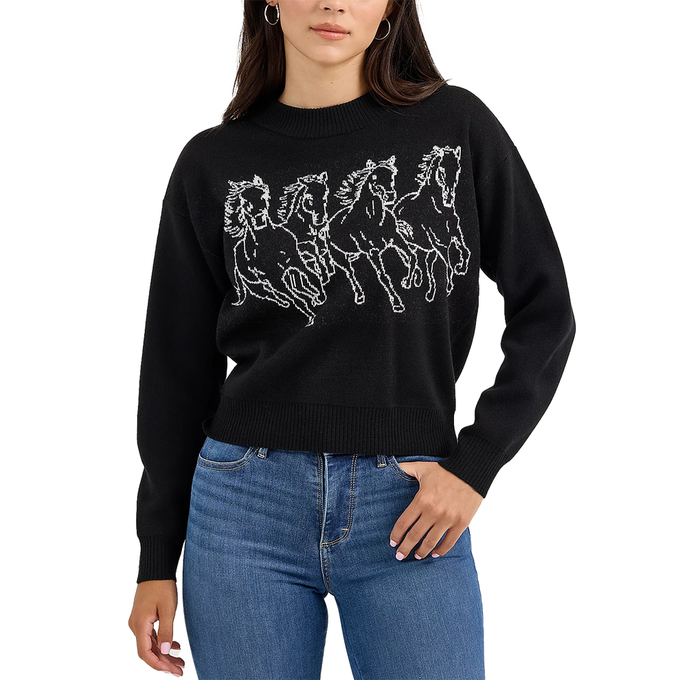 Cozy up the cowgirl way with our Women's Wrangler Retro Horse Instarsia Crewneck Sweater. Crafted to keep you comfortable in the cooler days ahead, it’s knitted for softness and lightweight warmth, with intarsia artwork of running horses across the chest. This sweater comes with an easy pullover design you can throw on in a hurry, a regular fit, a slightly cropped silhouette, and dropped shoulders.