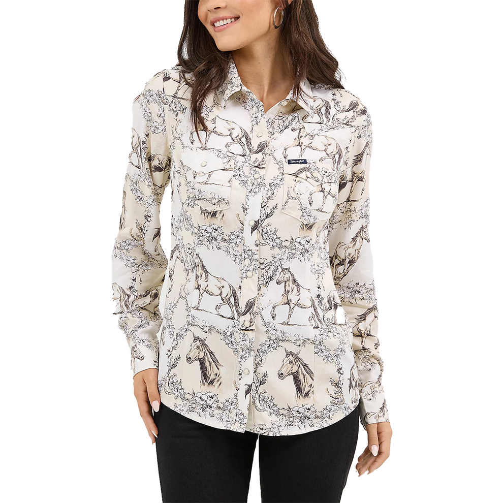 Ready to steal the show, our Women's Wrangler Retro Saddle Up Western Snap Shirt will take any outfit up a notch. It's super-soft with a colorful print that tells the world where you'd rather be—in the West. It features a slim fit that shows off your curves and a full snap closure for easy layering. Plus, this collared shirt comes with two chest flap pockets, pointed yokes, and a curved hem for extra Western authenticity.